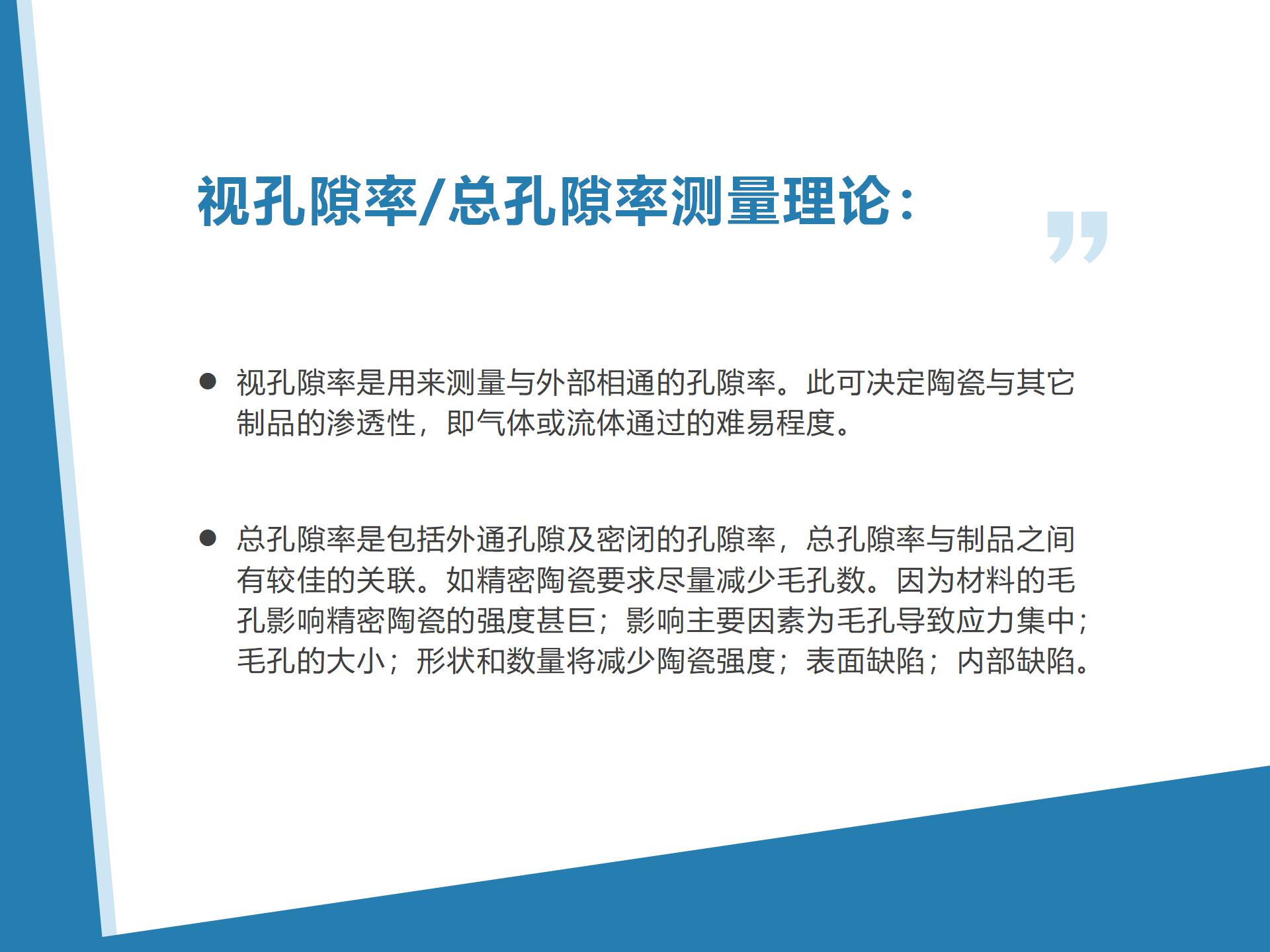 視孔隙率測(cè)量理論:是用來(lái)測(cè)量與外部相通的孔隙率。此可決定陶瓷與其它制品的滲透性,即氣體或流體通過(guò)的難易程度。