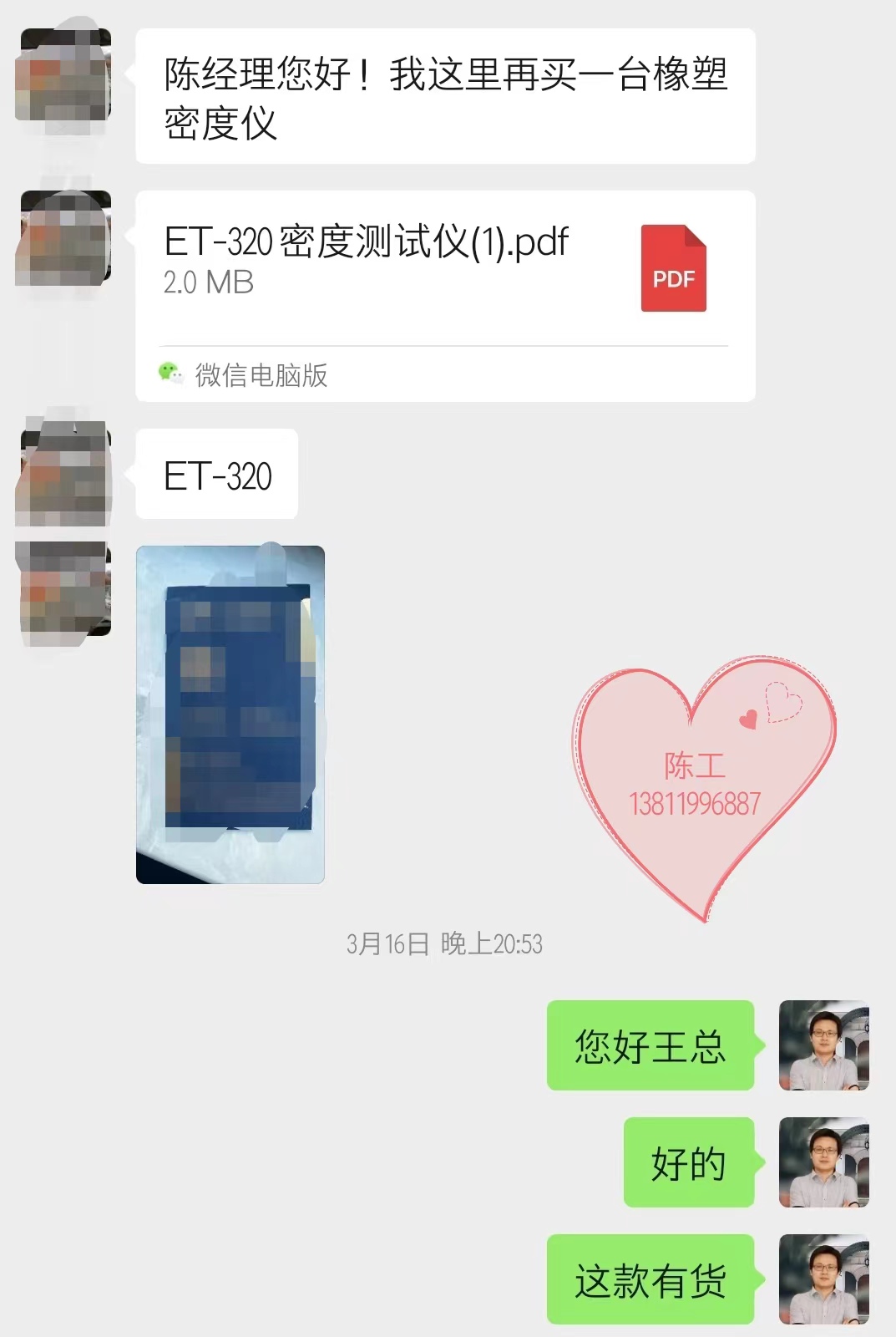 塑料密度的測定方法,塑料行業(yè)常用的密度儀器ET-320,也是我們的塑料行業(yè)在用過這個(gè)型號的密度計(jì)后,建分廠復(fù)購和轉(zhuǎn)介紹多的一個(gè)型號,像這位王總時(shí)隔2年再拿采購ET-320密度測試儀。