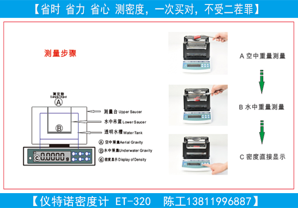 在采用ET-320固體顆粒密度測定儀測量密度時,原理與方法都是簡單,易上手操作的,概括起來就是2個步驟(如下圖:)