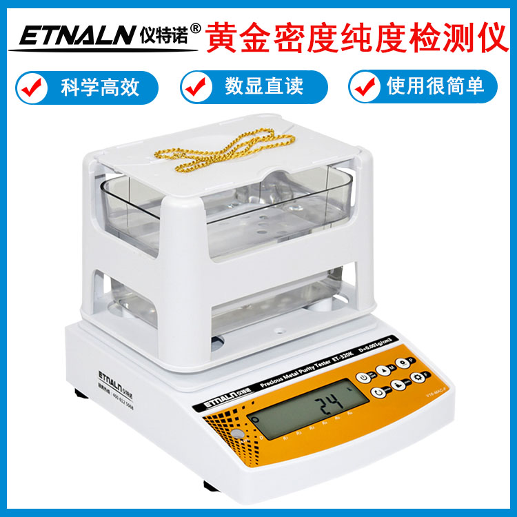 黃金密度計_貴金屬純度檢測儀_黃金首飾檢驗真假的儀器,ET-320K,ET-600K 、ET-1200K系列產品屬升級換代產品,相對于其它競爭產品,本系列產品重點提升了稱重精度,簡化了操作步驟與方式,升級了軟件的應用功能,使得測量結果的可靠性得到進一步提高;并分別具有黃金、鉑金、銀三個含量測量模式及一個合金測量模式。