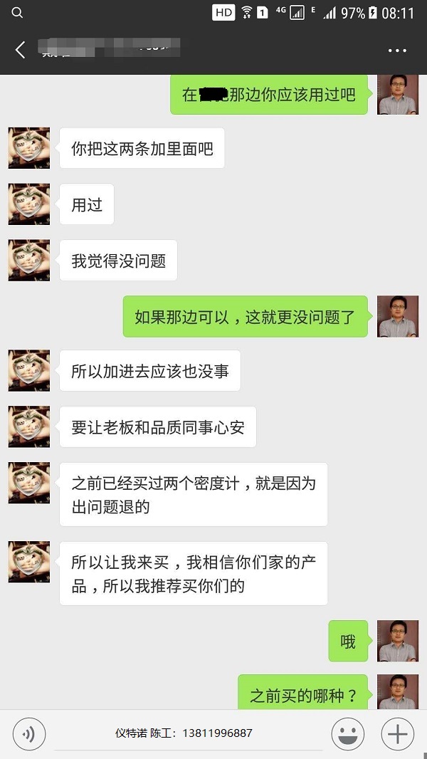 這位高精度密度儀ET-120S客戶,在采購(gòu)儀特諾密度計(jì)之前,從別家采購(gòu)過(guò)2臺(tái)密度儀,因?yàn)槊芏葯z測(cè)質(zhì)量達(dá)不到管控要求,密度精度達(dá)不到而退貨的,使用人員在上家單位用過(guò)儀特諾高精度密度儀ET-120S,故而選擇來(lái)與儀特諾合作。